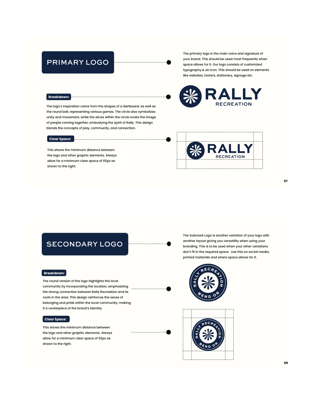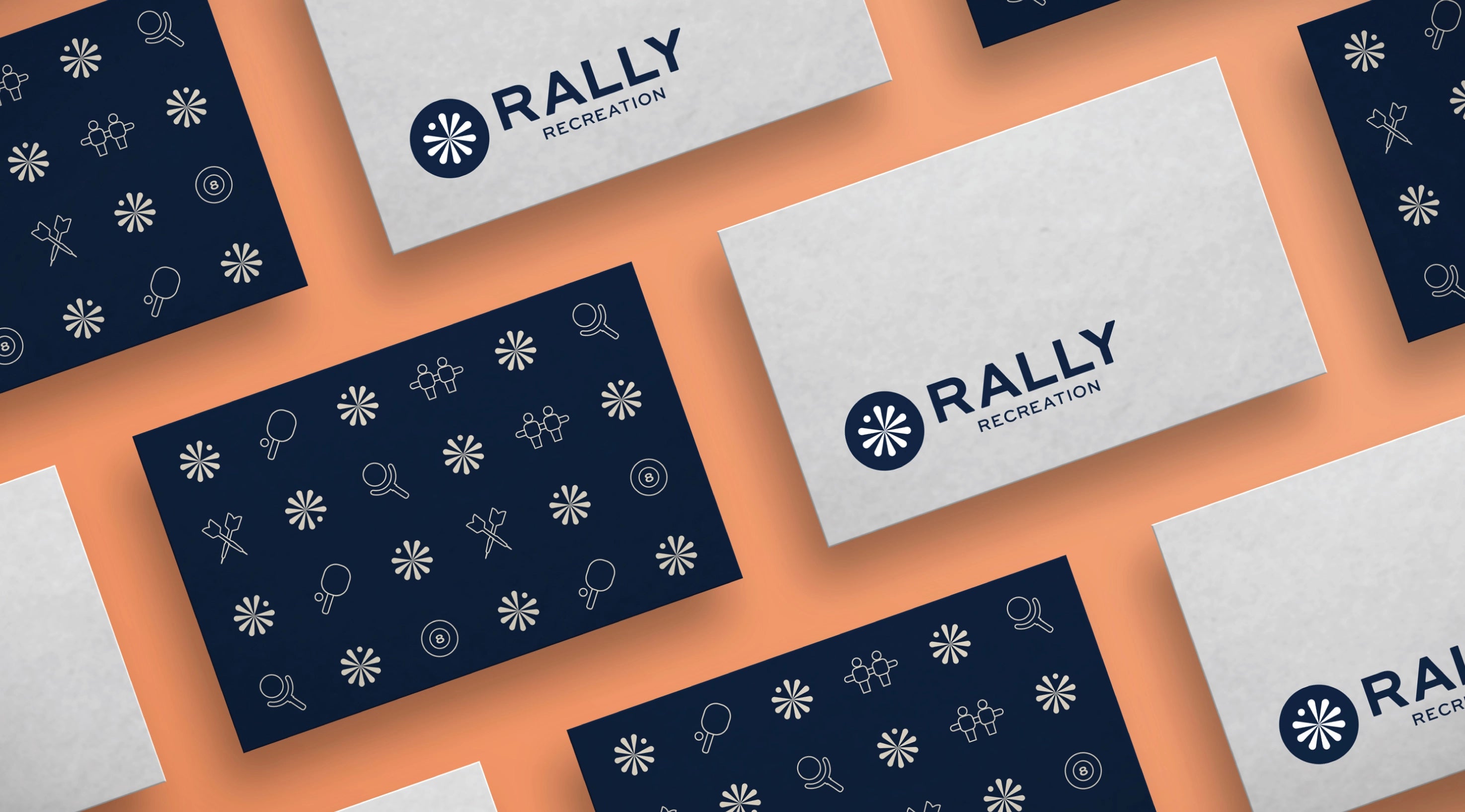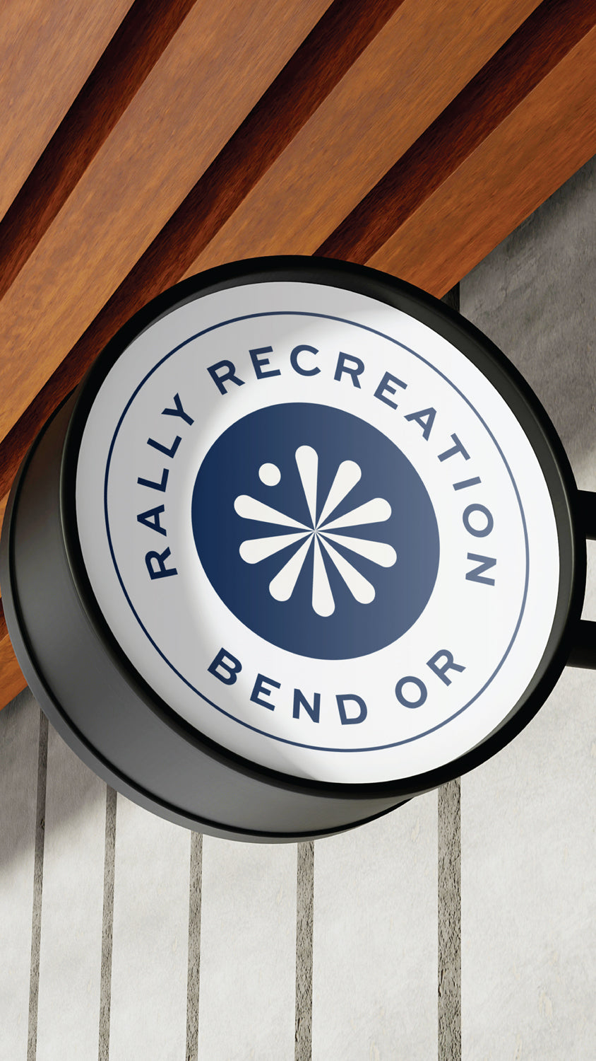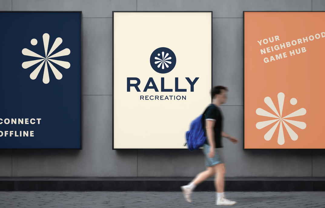 The Rally Recreation logo was designed to capture the essence of play and community, with a bold, modern design inspired by a dartboard to symbolize gathering, competition, and fun. The logo features vibrant navy blue and lime green colors, representing energy, connection, and inclusivity. The brand guidelines ensure consistency across all touchpoints, with clear rules for logo usage, typography, color palette, and tone of voice. The branding maintains a clean, approachable aesthetic that aligns with Rally Recreation’s mission to offer a vibrant, screen-free environment, reinforcing their focus on fun, community engagement, and well-being.